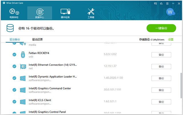 ①在“救援中心(Rescue Center)”,Wise Driver Care会自动扫描并列出来所有的硬件驱动,选择要备份的驱动,所有的已备份驱动文件都储存在计算机上的默认文件夹 (C:\MyDrivers\backup\),当然也可以选择另存为在别的文件夹;