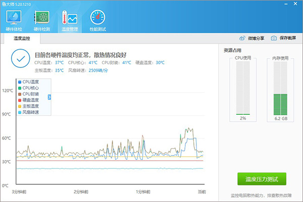 现在越来越多的用户都在使用鲁大师软件,因为它能够帮助用户快速升级补丁、安全修复漏洞、系统一键优化、一键清理、驱动更新等,适合于各种品牌台式机、笔记本电脑、DIY组装机,可以全面检测电脑硬件信息,有效预防硬件故障,让您的电脑免受困扰。此外,鲁大师还能轻松辨别电脑硬件的真伪,保护电脑稳定运行,有效的优化清理系统,提高电脑运行速度。软件在检测硬件温度这块,会显示计算机各类硬件温度的变化曲线,包含了CPU温度、显卡温度(GPU温度)、主硬盘温度、主板温度等,从而让你对电脑性能一目了然。