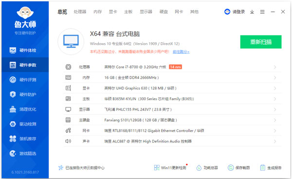 用户可在“硬件概览”中看到自己计算机的硬件配置报告,包括操作系统处理器型号、主板型号等。