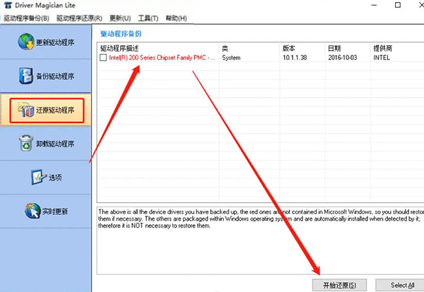 5、最后,我们切换至Driver Magician Lite的“还原驱动程序”操作界面,可以看到我们备份好的驱动程序。如果需要还原电脑的驱动程序,就点击界面右下方的“开始还原”按钮。