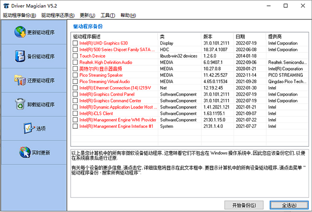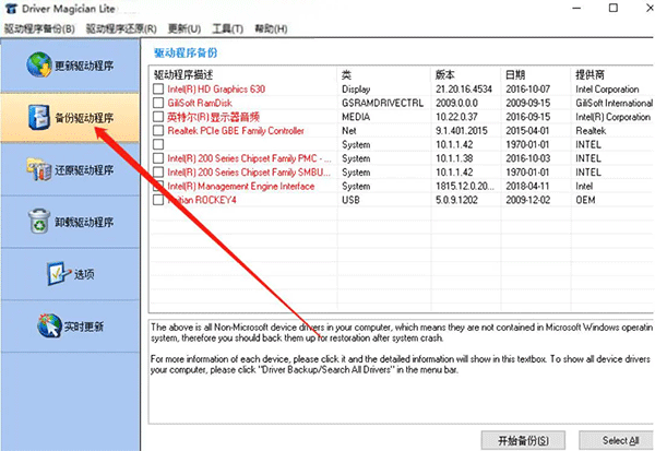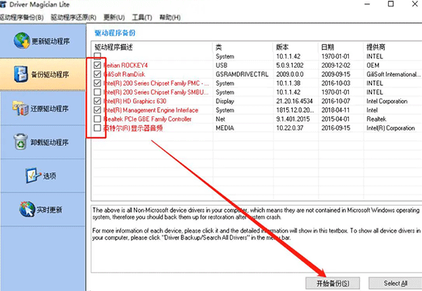 2、然后,在Driver Magician Lite界面中,我们勾选自己想要备份的驱动程序,再点击界面右下方的“开始备份”按钮。