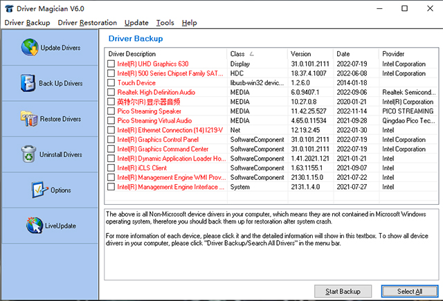 最让我觉得实用的是它的智能备份功能。它会自动识别哪些驱动是系统自带的(显示为黑色字体),哪些是你自己安装的(显示为红色字体)。这样一来,你只需要备份那些重要的、自己安装的驱动,既节省了空间,又方便管理。