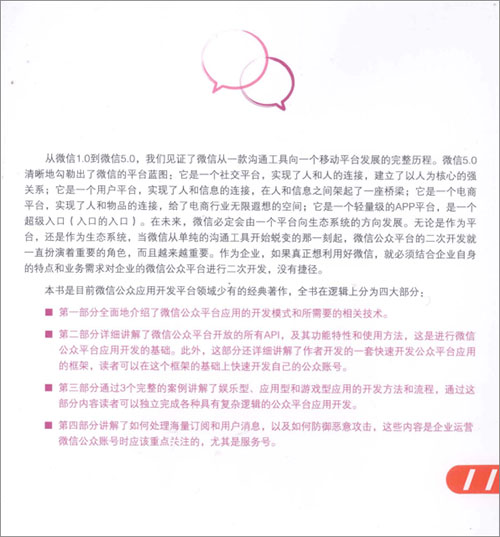 我觉得这本书非常适合想在微信公众平台上推广业务的开发者阅读。书中不仅理论扎实,还注重实践,通过具体案例帮助读者理解如何将技术应用到实际项目中。特别是关于性能优化和安全防护的内容,对企业运营非常有参考价值。