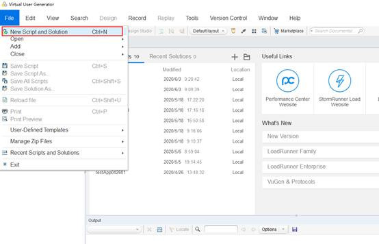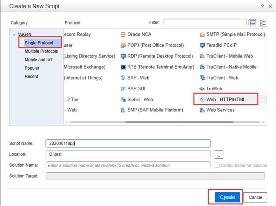 3、启动Loadrunner12 Virtual User Generator,点击File – New Script and Solution,在Single Protocol中选择Web – HTTP/HTML,在输入脚本名字和存储位置后,点击Create,