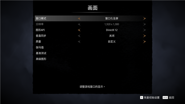 6、点击画面,自定义设置窗口模式、分辨率、垂直同步、质量、高级图形等参数