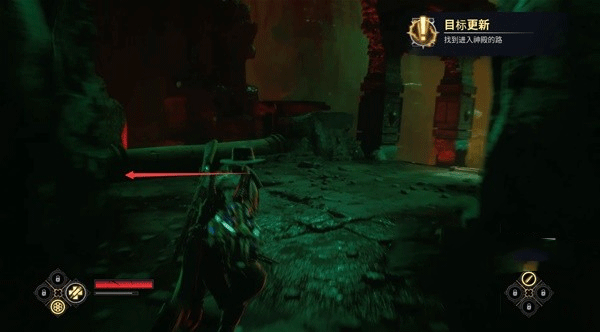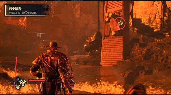 2、前方射爆炸药即可通过,在此之前先去左边钩绳荡过去可以捡到点钱;