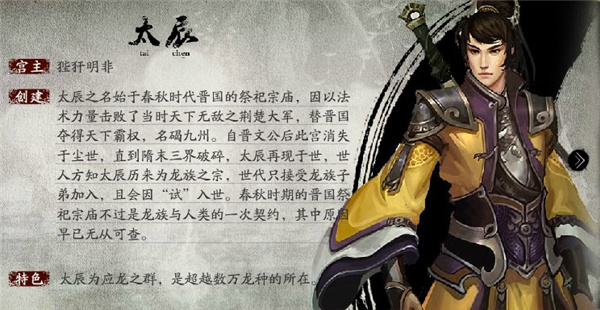 创建:太辰之名始于春秋时代晋国的祭祀宗庙,因以法术力量击败了当时天下无敌之荆楚大军,替晋国夺得天下霸权,名碣九州。自晋文公后此宫消失于尘世,直到隋末三界破碎,太辰再现于世,世人方知太辰历来为龙族之宗,世代只接受龙族子弟加入,且会因“试”入世。春秋时期的晋国祭祀宗庙不过是龙族与人类的一次契约,其中原因早已无从可查。