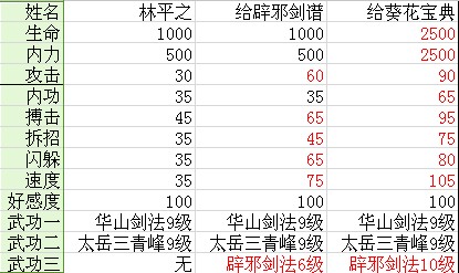 评价:华山路线的话可以考虑加他,不过自己就学不到辟邪剑法了(不过问题不大,因为学辟邪剑法和葵花宝典都需要自宫,我反正都不学,想学的可以在结婚后再学,不然就不能结婚了)。不过游戏中比林平之厉害的队友还有好几个,因此放弃也不可惜。