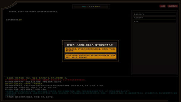 游戏的游历玩法以MUD类游戏为基础,构建一个开放的江湖。你可以摆脱主线剧情的限制,带领弟子在地图中自由探索。
