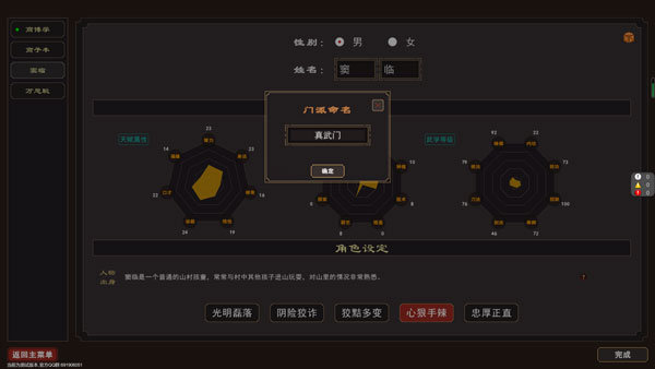 游戏特色包括开放的游历玩法,以MUD为基础实时变化的江湖世界,丰富的支线任务和随机事件。玩家可以通过探索、解谜甚至偷盗获得武学,打造神兵利器,并通过策略战斗提升战力。新手需要合理分配资源,建造农庄、庖屋等基础建筑来维持门派发展。