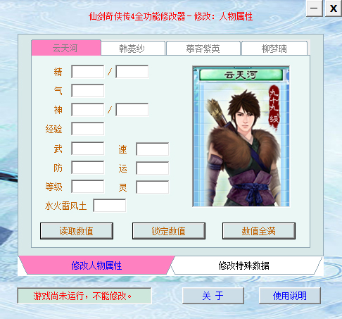 1、修改云天河,韩菱纱,慕容紫英和柳梦璃的人物属性:包括精,气,神,经验,武,速,防,运,灵,等级和水火雷风土。