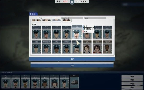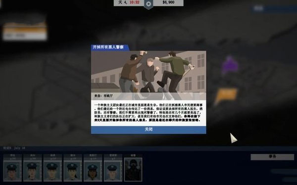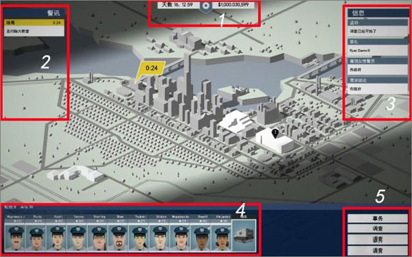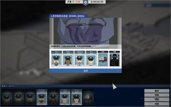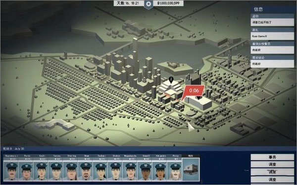 如图所示,警察局长的一天就在此界面中度过,指派手下的警员和警探前往各个事发地点处理案子。