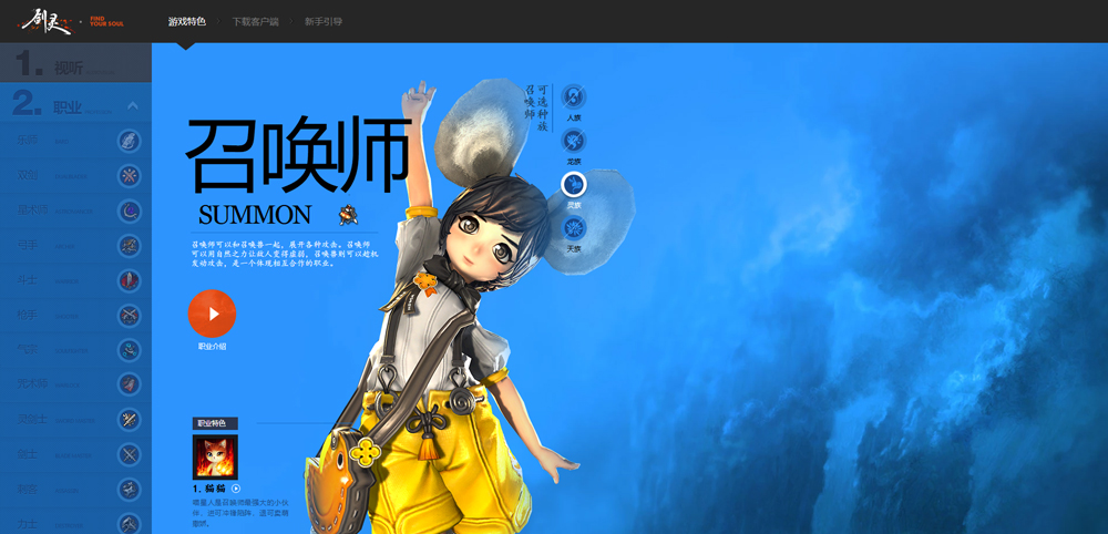 召唤师是游戏中的一个远程攻击性职业,主要擅长远程攻击、控制及辅助。这个职业可以使用法杖作为武器,并召唤可爱的小猫作为召唤兽协同作战。召唤师的主要战斗风格是借用自然之力将怪物弱化,再由召唤兽上前进行攻击。此外,召唤师还可以通过“鼓励”来将自身生命值传给召唤兽,以及使用“蒲公英种子”来保护周围的同伴。召唤师在所有职业中生命值最低,但拥有高效的恢复手段,因此在战斗时相对安全。大部分的战斗都依靠召唤兽,因此角色培养相对简单。然而,在与其他玩家的战斗中,如PvP,对操作的要求会非常高。