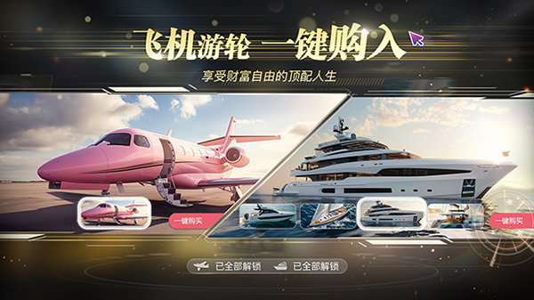 7、除了常规“富人标配”的商品外,私人飞机、私人游艇这种只能在电视剧中看到的商品也可以一键购入,让你尽情享受财富自由的顶配人生。