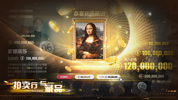 3、以上的商业玩法如果都需要通过长期决策赚钱暴富的话,那么拍卖行玩法则可以让你体验一夜暴富的爽感,在游戏拍卖行中,你不仅可以通过你的财力,竞得价值连城的藏品,成为收藏家,还可以通过你的眼力和判断力“捡漏”,花很少的钱拍得的藏品也有可能会卖出很高的价格,获得“天降横财”。