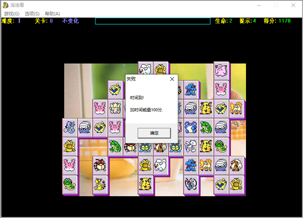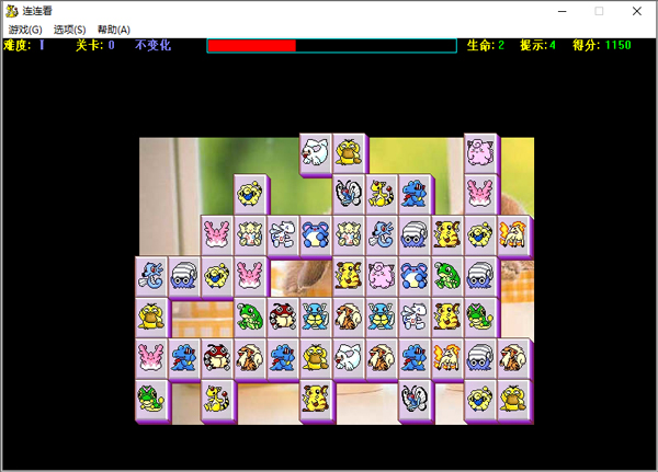 按回车键可暂停时间、隐藏牌面(最小化状态);再用鼠标点击屏幕底部任务栏中连连看项,可展开牌面并继续游戏。