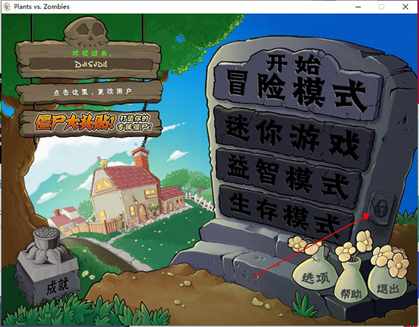 3、我们可以看到游戏并没有解锁全部关卡,这时候找到墓碑旁边的小锁。