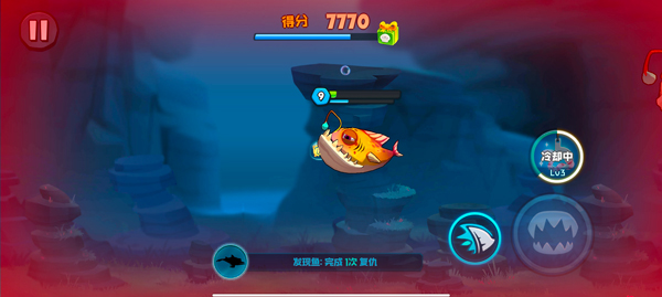 10~20级:当鱼来到10级之后,分数1万就会出现神秘秘宝;我们可以靠运气来开这秘宝,运气好开出饕餮盛宴可以直接升到20多级。运气不好的话只能依靠在其他大鱼周围来回游动,趁机去掠夺肉块来完成升级。