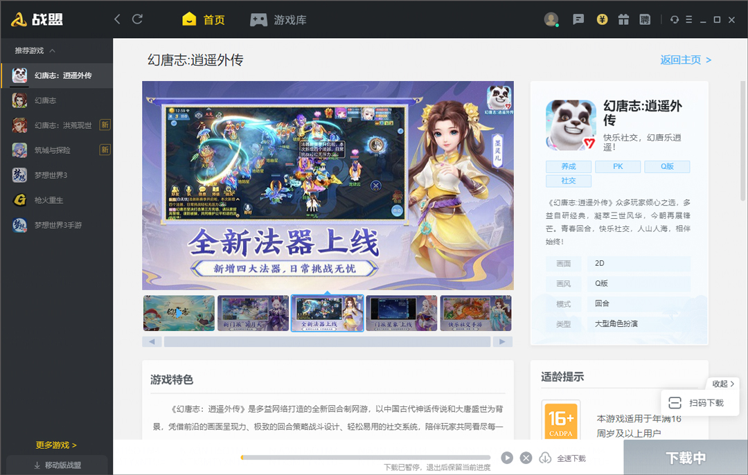 幻唐志逍遥外传电脑版是由多益网络独家推出的一款快乐社交RPG游戏,原名神武4,支持安卓/ios用户登录,数据与移动端完全互通,以中国古代神话传说和大唐盛世为背景,拥有武侯府、天策、南海普陀、东海龙宫等十一大门派职业,门派定位广泛物理、法系、治疗各有春秋,每个角色都能从属的4个职业之中选择其一进入游戏世界,精湛的游戏画风,精美的人物刻画,无不散发着迷人的韵味色彩,轻度休闲的人物、装备及萌宠养成,组队、帮派、结婚、结拜社交互动玩法,搭载着原汁原味的跑商、师门、抓妖等热门活动,情缘社交,经典再续,只为让你享有舒适惬意玩法和欢快愉悦的精彩体验。