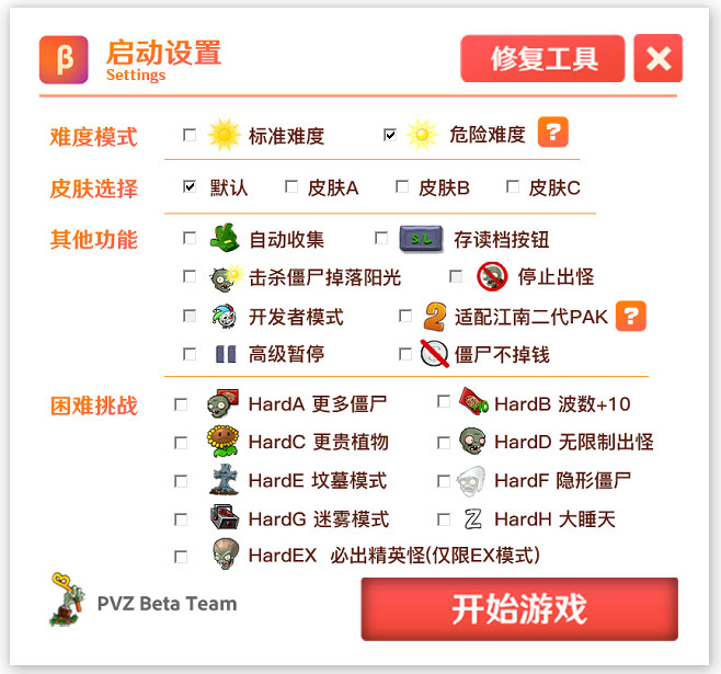 2、设置启动设置:包括游戏难度,皮肤选择,困难挑战等;