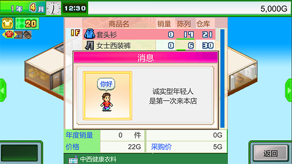 《时尚洋品店物语电脑版》是一款由开罗公司开发的模拟经营游戏,玩法丰富,画面采用怀旧像素风。玩家可以体验经营时尚店铺的乐趣,从进货、装修到雇佣员工,全方位感受开店的酸甜苦辣。作为新人玩家,第一次进入游戏可能会被英文界面吓到,但切换中文后就能轻松上手了。