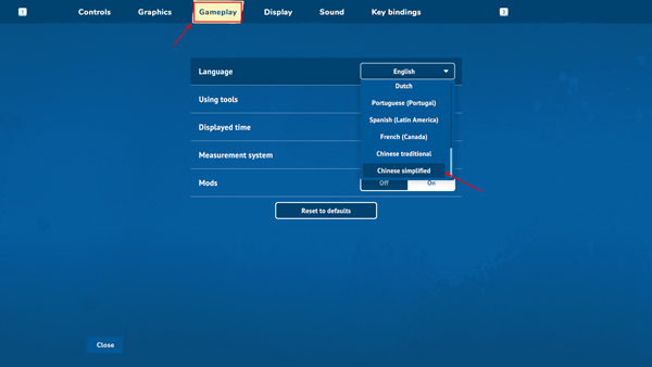 2、点击gameplay,然后找到language语言,点击english,下滑找到chinese点击确认;