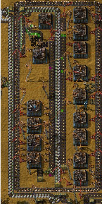 我中间是摆了两红两绿,长度可以任意修改,强迫证玩家在原材料采集的时候全部接到铁带子、铜带子在输入到循环带子,这样无论资源怎么枯竭运送铁和铜的总带子和红绿模块都都可以永远不去管他了