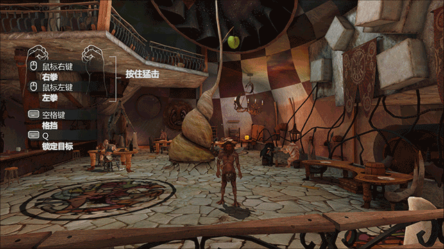 一开始他会防御,使用冲撞攻击他(W+shift+鼠标左键)撞晕后猛击他的头部,蓄力条达到一定长度就可以使用重击(站着不动 鼠标左键+右键)用重拳把敌人打飞后,
