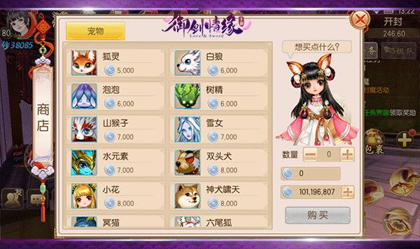 宠物在《御剑情缘》中可以跟随玩家战斗,为玩家增添战力,宠物的品质有野生、宝宝、变异三种,其中刚获得的宠物一般都是野生的,玩家可以通过道具“洗髓丹”来为自己的宠物进行洗髓,洗髓后一般都是宝宝,有极小几率成为变异宠物。在新手主线中我们可以获得第一只宠物“狐灵”,而随着等级提升至35级,我们又能在“福利─等级福利”中领到一只“白狼”,而怎么获得更多种类的宠物呢,这就需要我们去一般主城中寻找名为“宠物商人”的NPC进行购买了。