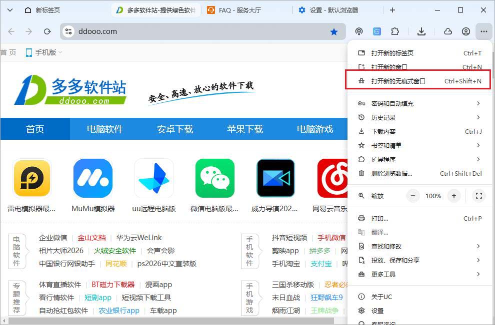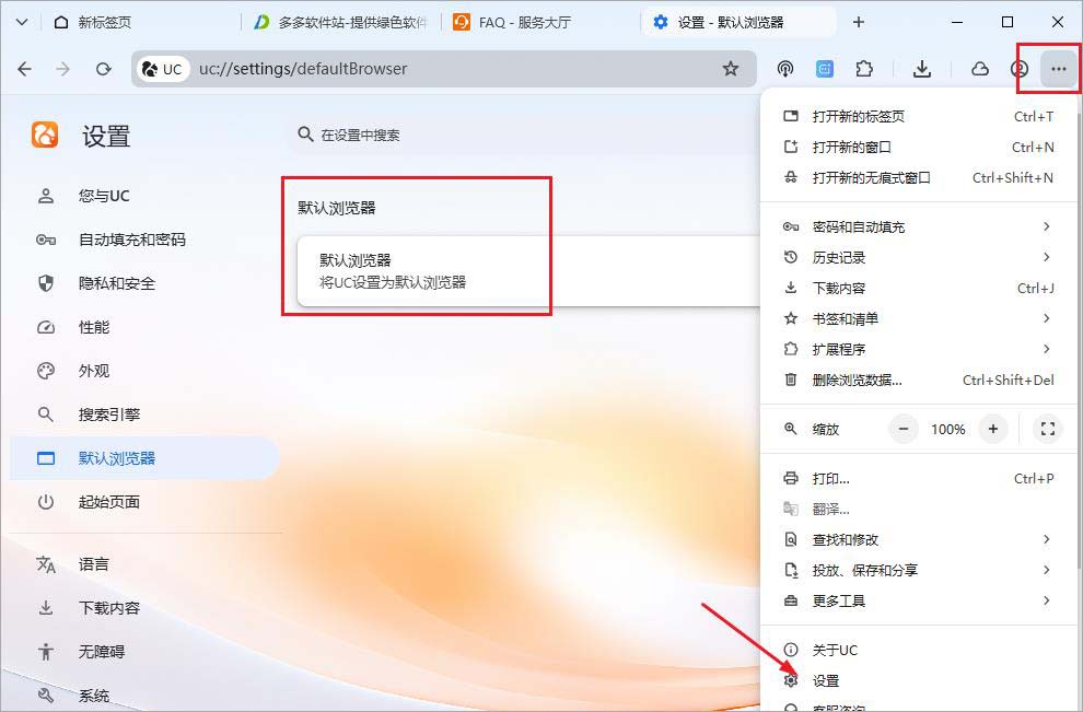 2、点击浏览器窗口右上角“...”可在设置页面将UC设置为默认浏览器