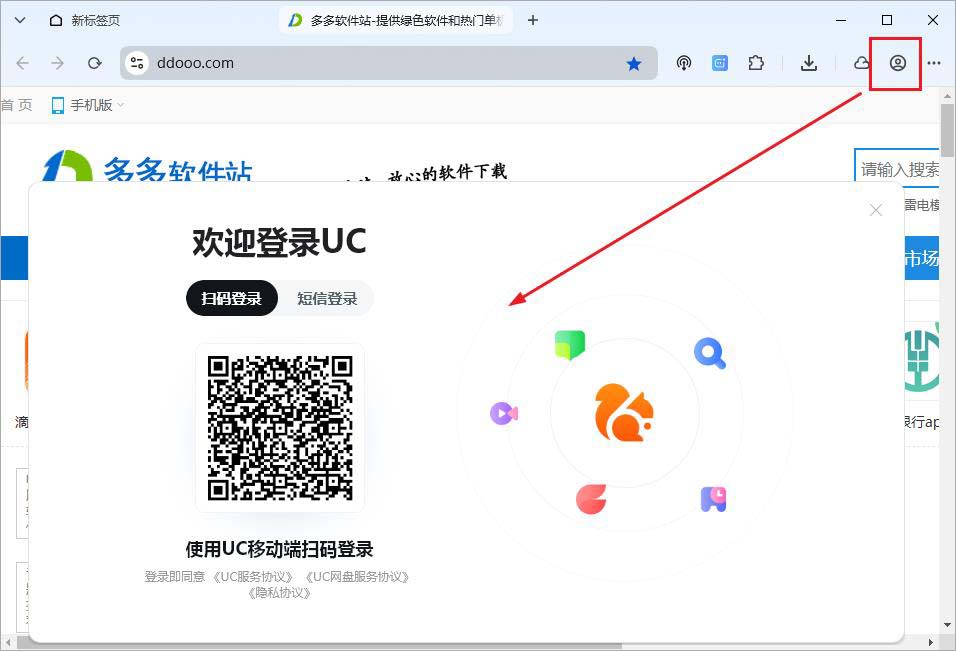1、本站下载安装并打开UC浏览器电脑版,点击右上角头像图标即可弹出登录窗口