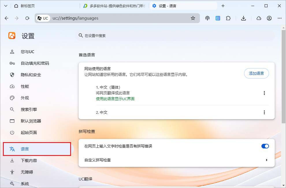 5、打开设置,点击语言可选择您浏览网站时的首选语言。