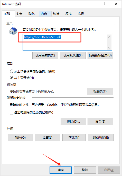 2、在“主页”框里输入想设置的网址,点击确定即可