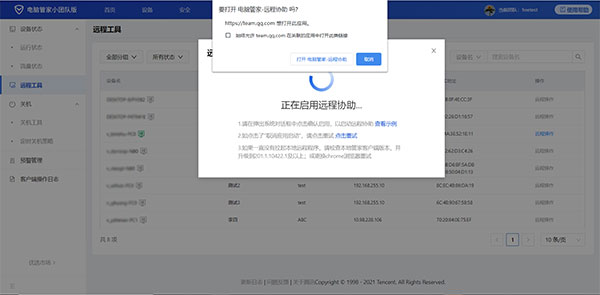 在启用过程中,浏览器中弹出操作确认弹窗,在该弹窗点击<打开电脑管家-远程协助>按钮,若误触<取消>按钮,点击请求弹窗中的<点击重试>按钮,重新拉起浏览器的确认弹窗;