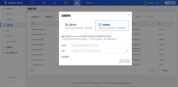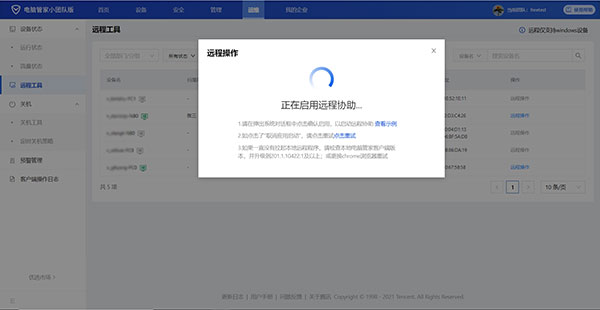 在运维/远程工具页,选择一台要远程的设备点击<远程操作>按钮,弹出远程操作弹窗,选择<远程协助>模块,点击<连接>按钮;