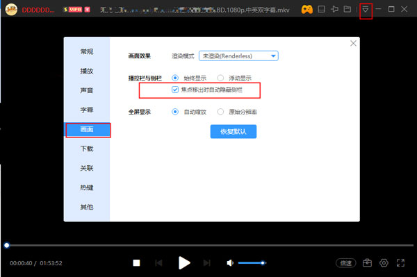 (1)展开右上角菜单,选择“设置中心”---“画面”,找到“播控栏与侧栏”设置;