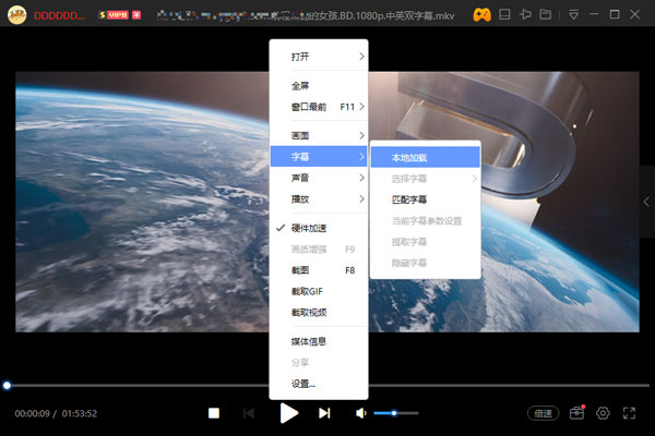 (3)手动添加:播放视频文件时,点击右键---“字幕”---“本地加载”,在弹出的选择框中选择需要加载的字幕文件,点击确定即可。