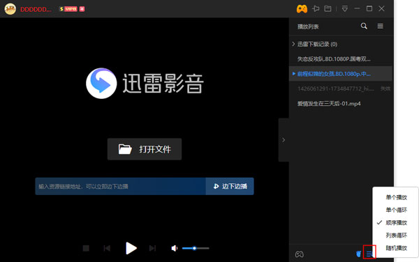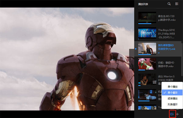 A:在右侧播放列表中,点击列表下方左侧按钮,选择单个循环,即可以对该视频循环播放。当然,也可以选择其他的播放模式。