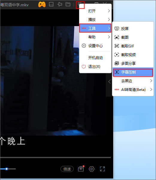 当前播放的视频带有内挂字幕或者外挂字幕,可以使用字幕压制功能。点击播放器右上角,选择“工具”---“字幕压制”,根据压制字幕的需要,选择压制方式、压制分辨率、输出画质。