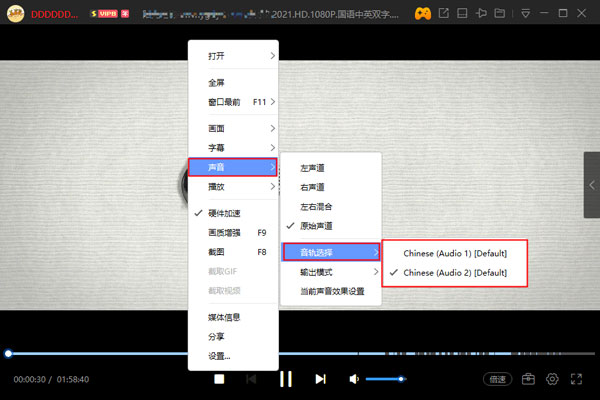 在播放页面中,点击右键,选择“声音”---“音轨选择”,可以选择需要的语言。