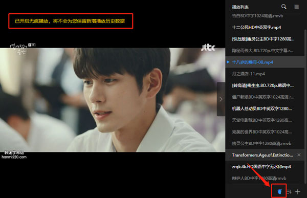 A:在播放列表区域的底部入口中,或在右键菜单中,选择无痕播放,将不会为您保留这期间的播放记录,保护您的播放隐私。