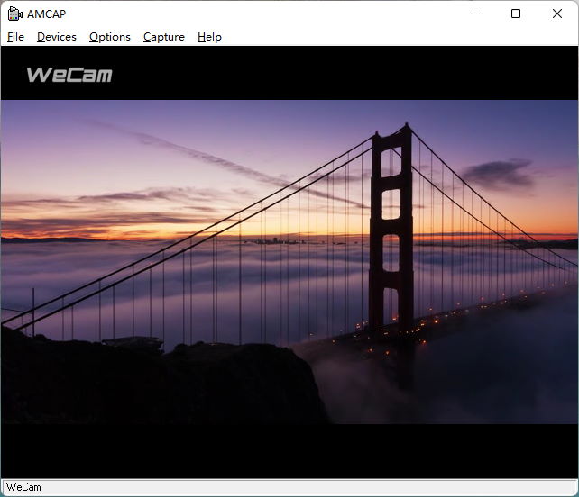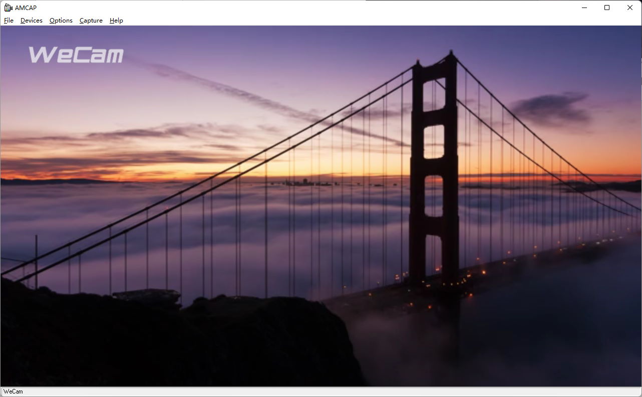 1、在WeCam安装后系统里面会多出一个名为“WeCam”的虚拟摄像头,它可以在所有使用摄像头的软件中使用,比如在AMCap中显示,