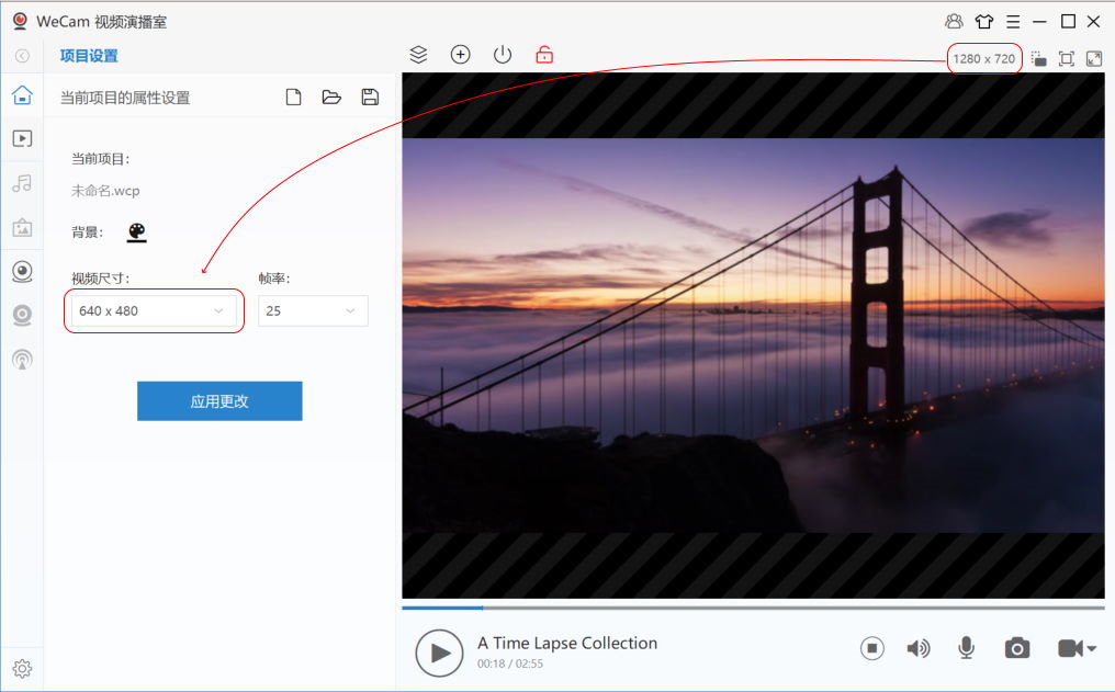 5、WeCam的默认尺寸是1280 x 720,想改成 480p 的?在项目设置>视频尺寸处选择640 x 480然后 应用更改即可,