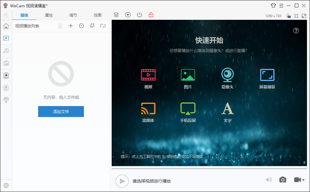 2、打开 WeCam 软件,在快速开始界面处(可通过 项目 > 新建项目 显示)您可以快速创建包含不同媒体对象的项目。默认情况下已经创建了一个“视频”对象,点击“添加文件”按钮便可为此对象导入视频文件,