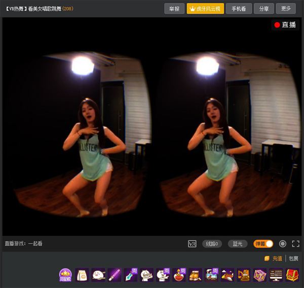 观众端进入直播频道后默认显示的全景直播模式,将鼠标放在画面中会显示出“启用VR模式”的字样,点击“启用VR模式”后,当画面中显示出摄像头画面就可以带上眼镜观看