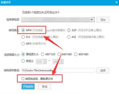 3、进入转码界面后,我们选择mp4格式,同时勾选【转码完成后,删除源文件】,这样可以节省我们的电脑内存;
