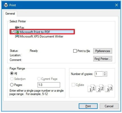 2、在“选择打印机”下,选择“Microsoft打印到PDF”选项。单击“打印”按钮。