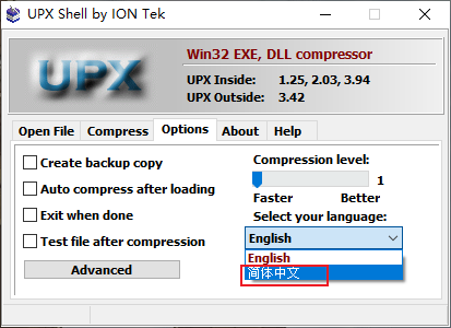 文章详细讲解了安装后的汉化步骤,只需要在“Options”中选择“简体中文”即可。此外,UPX Shell内置了多个版本的UPX压缩引擎,并优化了界面字体,让程序运行更流畅。