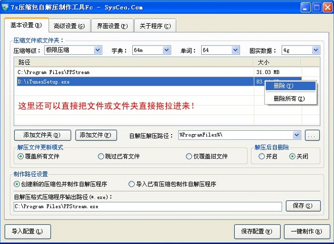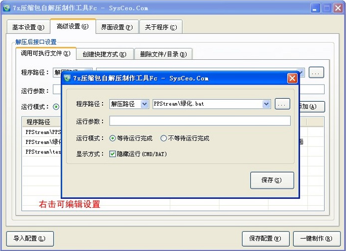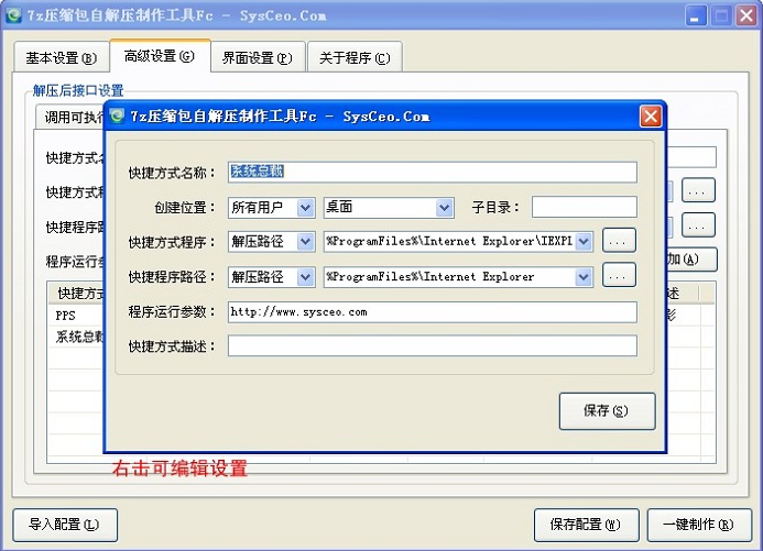 7z压缩包自解压制作工具formceo能够在系统封装时,将Program Files、我的文档、等等一系列想做做成自解压包并且在部署时调用的释放。同时它还可以将任何程序进行压缩打包并支持一键转换自解压,释放到指定的位置。你再也不用去找7z压缩和制作自解压的两款工具,这款小工具已经完美的将这两个功能融合到一起了。