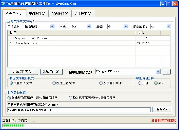 软件又称之为7z压缩包自解压制作工具Fc,完美支持任意文件夹的压缩都不需要到PE下操作,本程序将智能释放被占用的资源,保证压缩的完整性!本程序在PE下也可以正常使用。